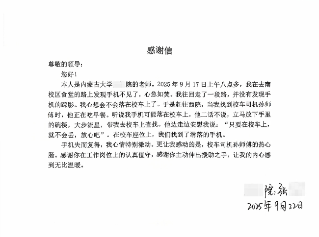 2025年9月17日上午,我校教师张老师在乘坐校车时不慎将存有重要资料的手机遗失,幸得我公司校车司机孙师傅及时伸出援手,手机很快回到主人手中。