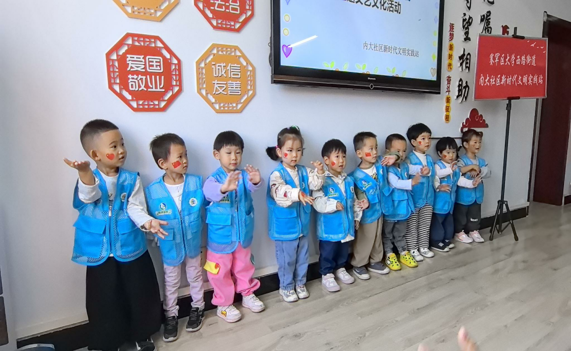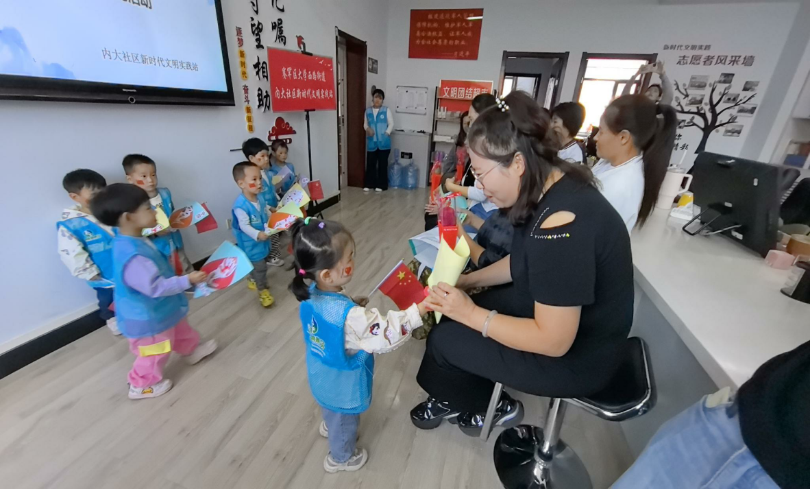9月30日,托育班幼儿走进内大社区,通过朗诵儿歌、赠送礼物等方式开展“童心礼赞”国庆主题活动,展现成长与自信。